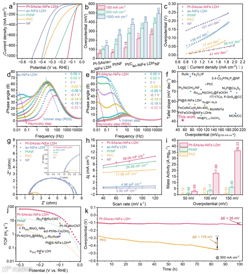 图3. 碱性淡水中的HER性能。(a, b) LSV曲线及其对应的过电位; (c) Tafel斜率;(d, e) 原位Bode相位图; (f) Pt-SAs/ac-NiFe LDH与文献报道的其它电催化剂HER性能对比; (g) Nyquist图; (h) Cdl; (i, j) Pt-SAs/ac-NiFe LDH及其对比样在不同电压下的质量活性和TOF值对比; (k) 稳定性测试。