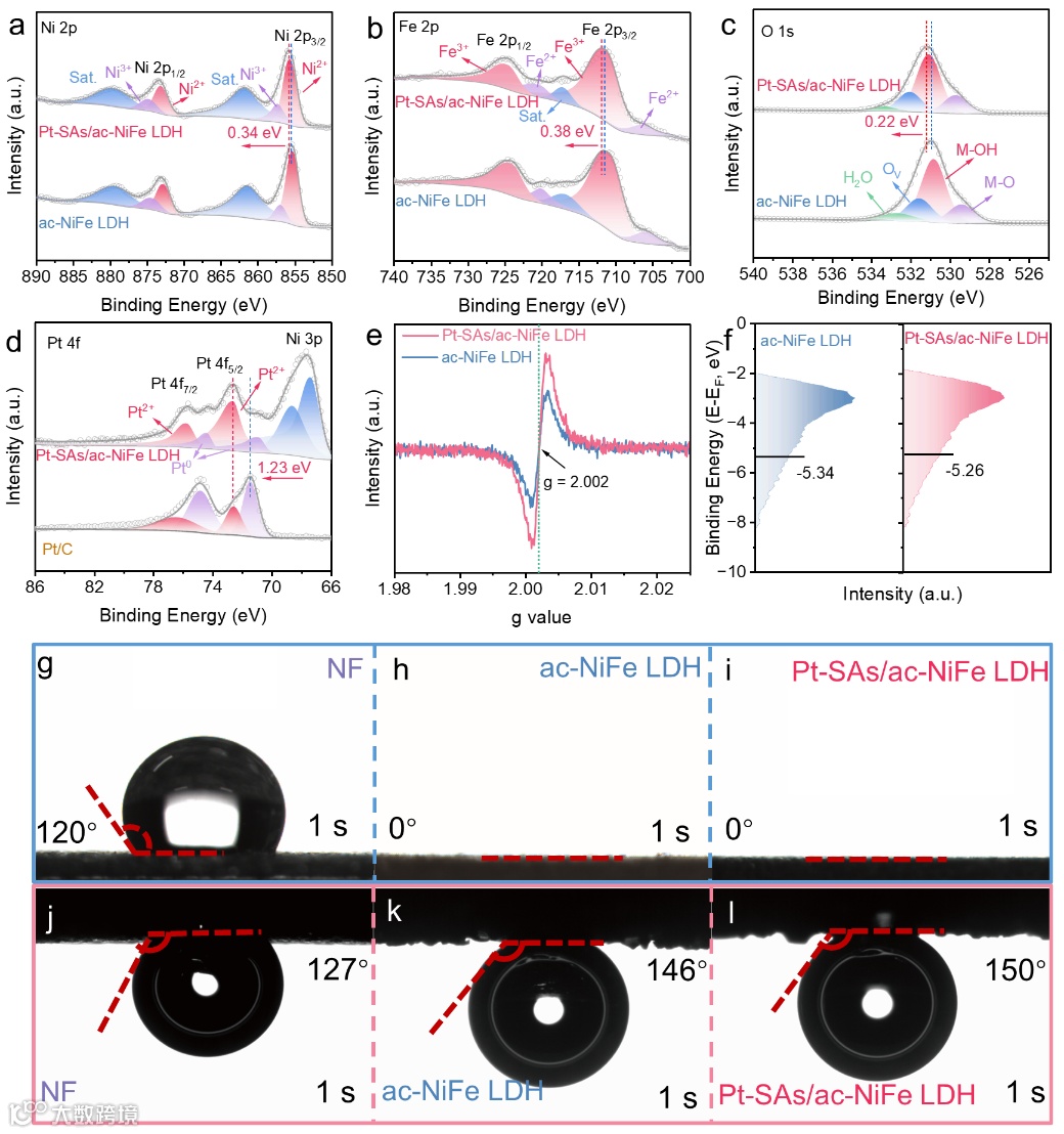 图 2. 表面电子结构分析及接触角测试。(a) Ni 2p的XPS图; (b) Fe 2p的 XPS图; (c) O 1s 的XPS图; (d) Pt 4f 的 XPS图; (e) EPR测试结果; (f) 价带谱测试结果;(g-i) 接触角测试; (j-l) 气泡接触角测试。