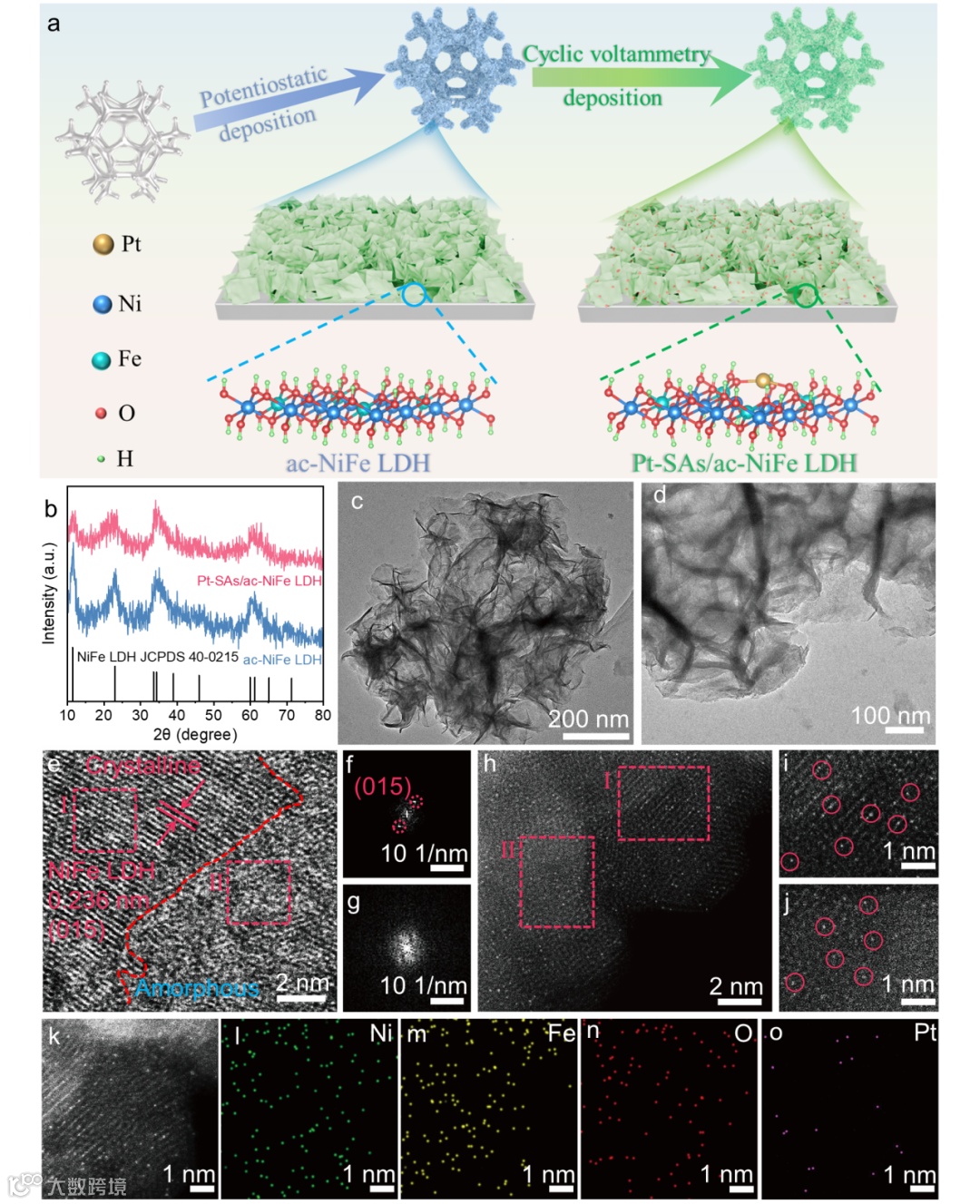 图1. (a) Pt-SAs/ac-NiFe LDH电催化剂的合成路线示意图; (b) Pt-SAs/ac-NiFe LDH和ac-NiFe LDH的XRD图; (c, d) ac-NiFe LDH和Pt-SAs/ac-NiFe LDH的TEM图; (e) Pt-SAs/ac-NiFe LDH的HRTEM图; (f, g) 图(e)中区域Ⅰ和区域Ⅱ的FFT图; (h) Pt-SAs/ac-NiFe LDH的AC-HAADF-STEM图; (i, j) 图(e)中区域Ⅰ和区域Ⅱ的AC-HAADF-STEM图; (k-o) 元素mapping图。