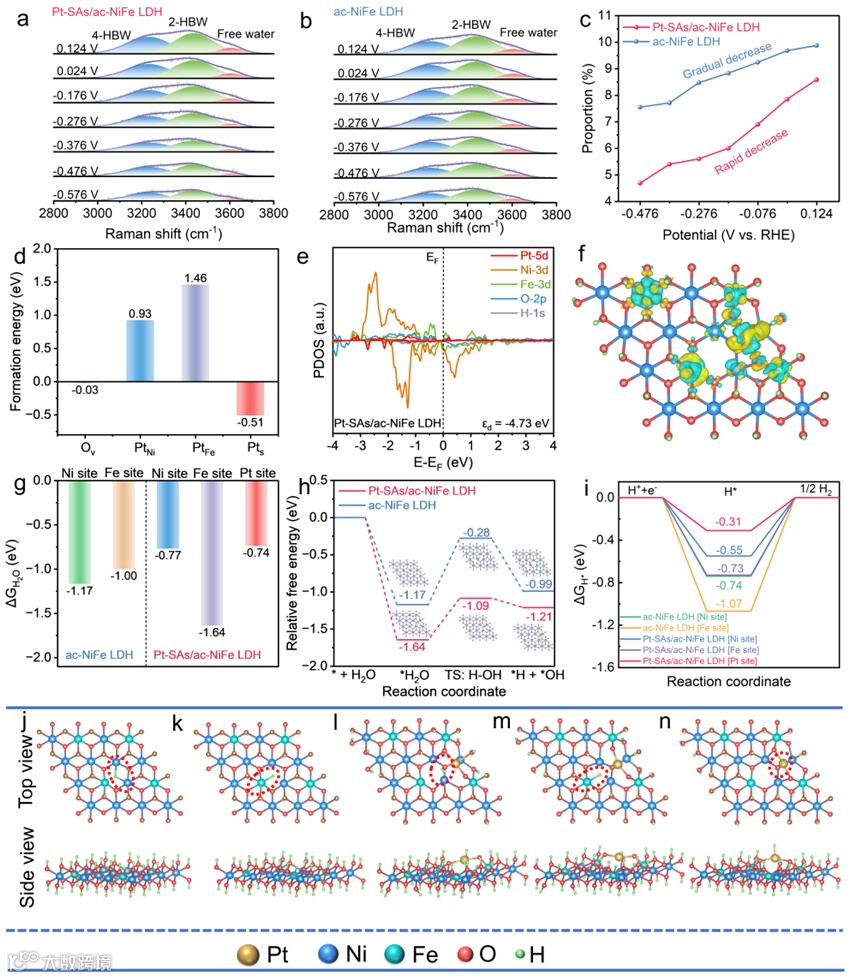 图5. 理论计算。(a-c) 原位拉曼光谱; (d) Ov、PtNi、PtFe和 Pts的形成能; (e) PDOS; (f) 差分电荷密度; (g) 不同位点的水吸附自由能; (h) 水解离过程的动力学势垒; (i, n) 氢吸附的自由能及相应吸附位点。