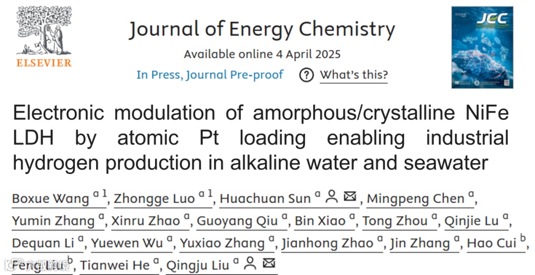 基于此,云南大学柳清菊教授团队通过分步电沉积策略成功制备了Pt单原子修饰的非晶/结晶NiFe LDH电催化剂(Pt-SAs/ac-NiFe LDH)。该催化剂结合了非晶区域丰富的缺陷位点和结晶区域优异的稳定性,这一特性显著增强了电催化析氢反应(HER)的催化性能。原位拉曼光谱与原位Bode相位分析结果表明,Pt单原子的引入促进了界面水的解离,加速Volmer反应过程。DFT理论计算进一步证实,Pt-SAs与NiFe LDH之间存在强烈的电子耦合作用,这有效促进了水的吸附与解离,优化了氢中间体的吸附和脱附,从而加速HER反应动力学。在碱性(海)水中,Pt-SAs/ac-NiFe LDH电催化剂分别仅需138 mV和141 mV的过电位即可实现1000 mA cm-2的电流密度,显著优于商用Pt/C催化剂。此外,该催化剂在500 mA cm-2的电流密度下能稳定运行超过100 h,展现出优异的长期稳定性。该研究成果为大电流密度条件下碱性海水电解制氢电催化剂的设计提供了新思路,展现出良好的工业应用潜力。该研究以“Electronic Modulation of Amorphous/Crystalline NiFe LDH by Atomic Pt Loading Enables Industrial Hydrogen Production in Alkaline Water and Seawater”为题,发表在知名期刊Journal of Energy Chemistry上。