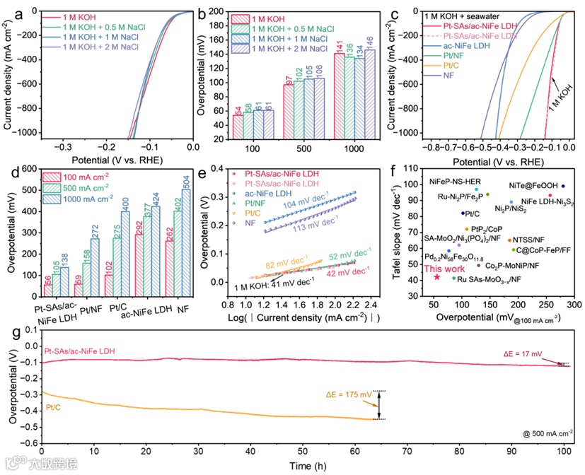 图4. 碱性海水中的HER性能。(a, b) 不同NaCl浓度下LSV曲线及其对应的过电位; (c, d) 碱性海水中LSV曲线及其对应的过电位; (e) Tafel斜率; (f) Pt-SAs/ac-NiFe LDH与文献报道的其它电催化剂在碱性海水中的HER性能对比; (g) 稳定性测试。