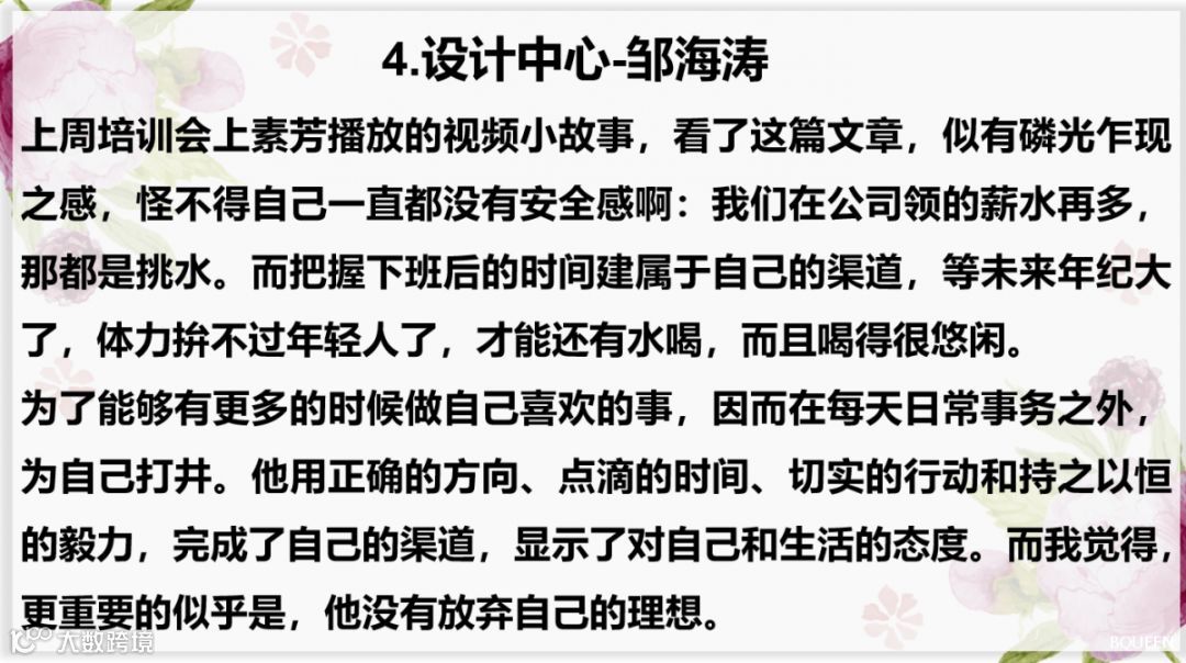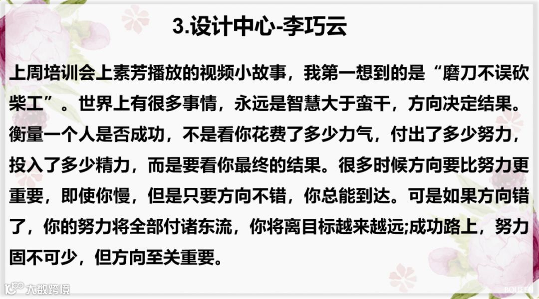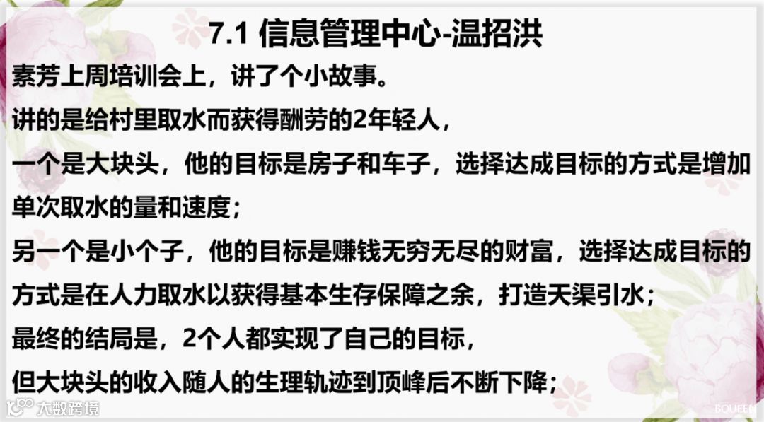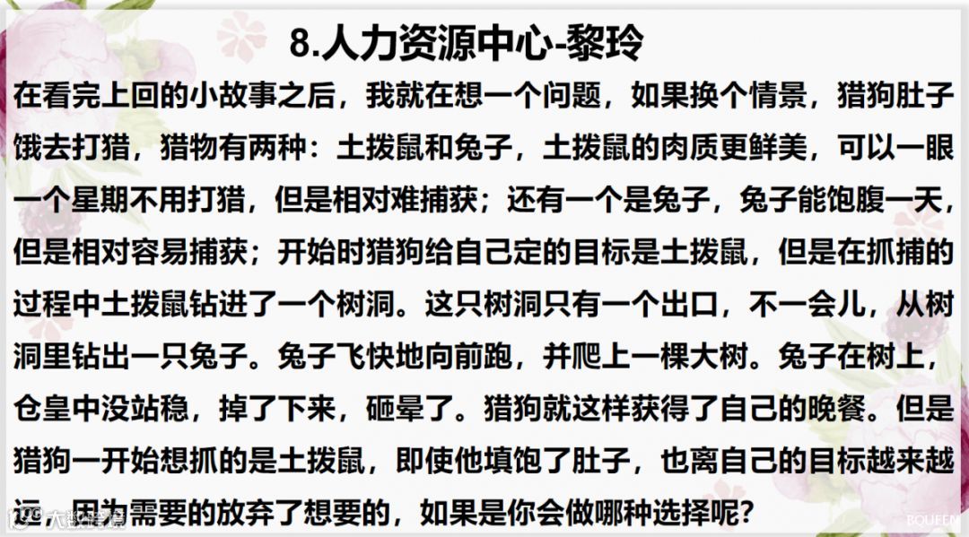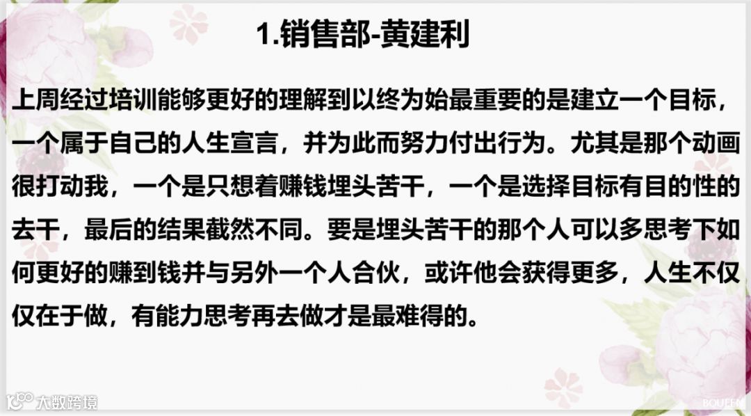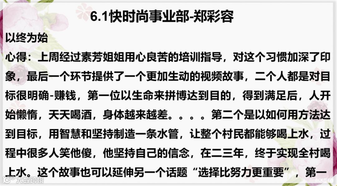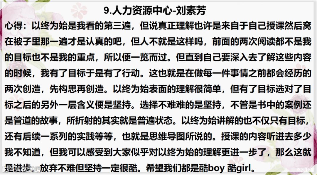 上周素芳小姐姐针对以终为始的上半部分进行了培训,小伙伴们对此有更加深刻的影响,所以,本期读书分享会主要内容为大家的课后心得!