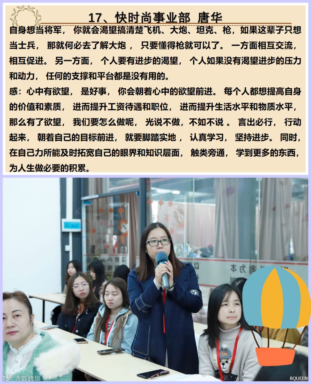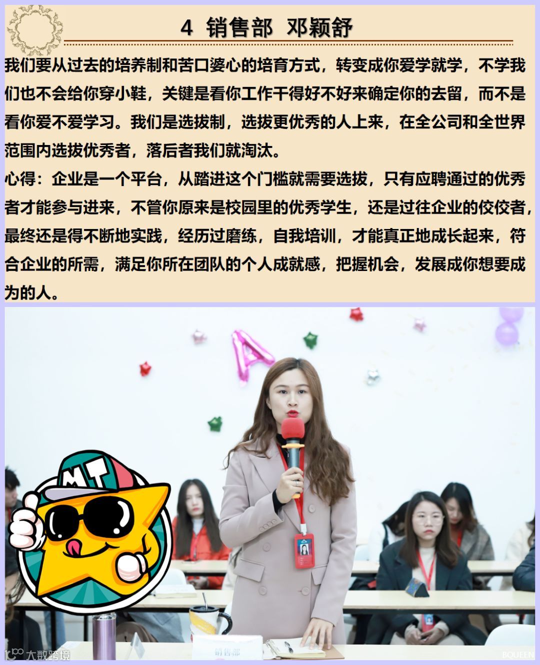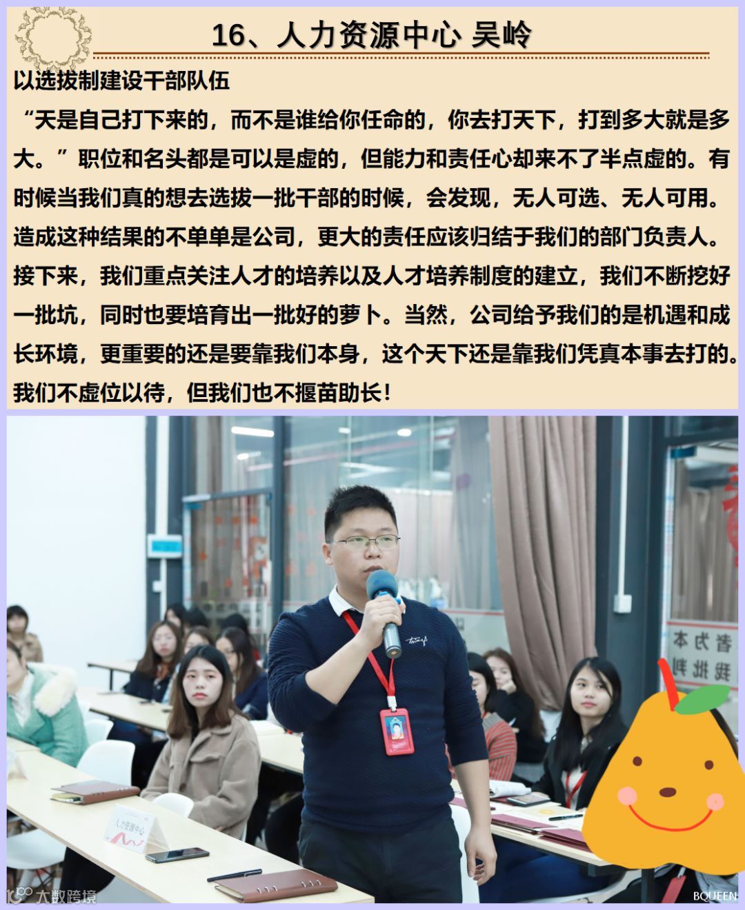 一个公司的发展,勤劳刻苦的精神是必备,这也正符合我们的核心价值观:长期艰苦奋斗,因为有这些肯吃苦劳作的员工,才有的公司今天的发展!该奖项由绩效管理委员会主任邓颖舒主持公布,上期刻苦钻研奖得主柯展超作为颁奖嘉宾出席!