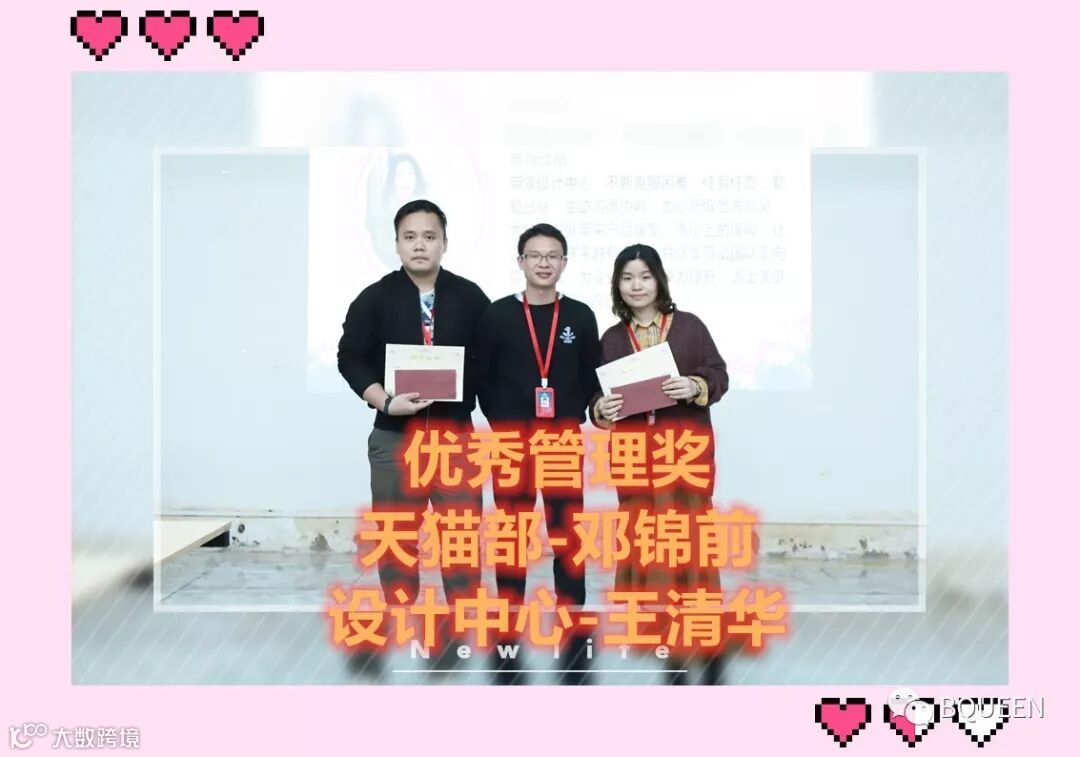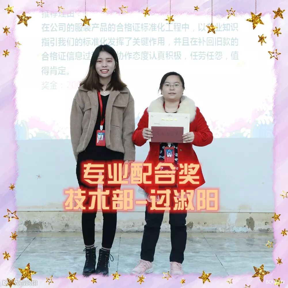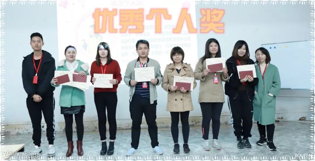 获得优秀个人奖的人员有:天猫部-谢增霞,生产部-曾凌,商品部-欧清锦,品控部-陈群,品控部-肖小英,物流部-梁秋明,物流部-李土燕,拓展部-韩笑娴。