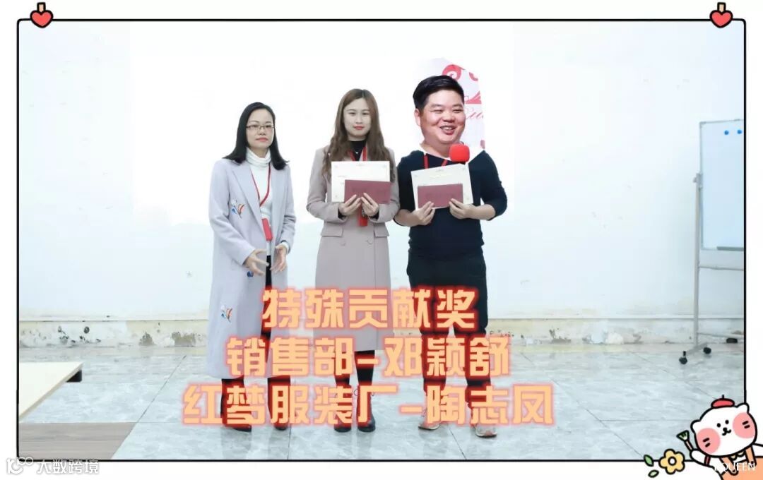 特殊贡献奖的设立是为了嘉奖为公司发展做出特殊贡献的人群,本期奖项由绩效管理委员会委员郑彩蓉主持公布,获得该奖项的人员有:销售部-邓颖舒,红梦服装厂-陶志凤。