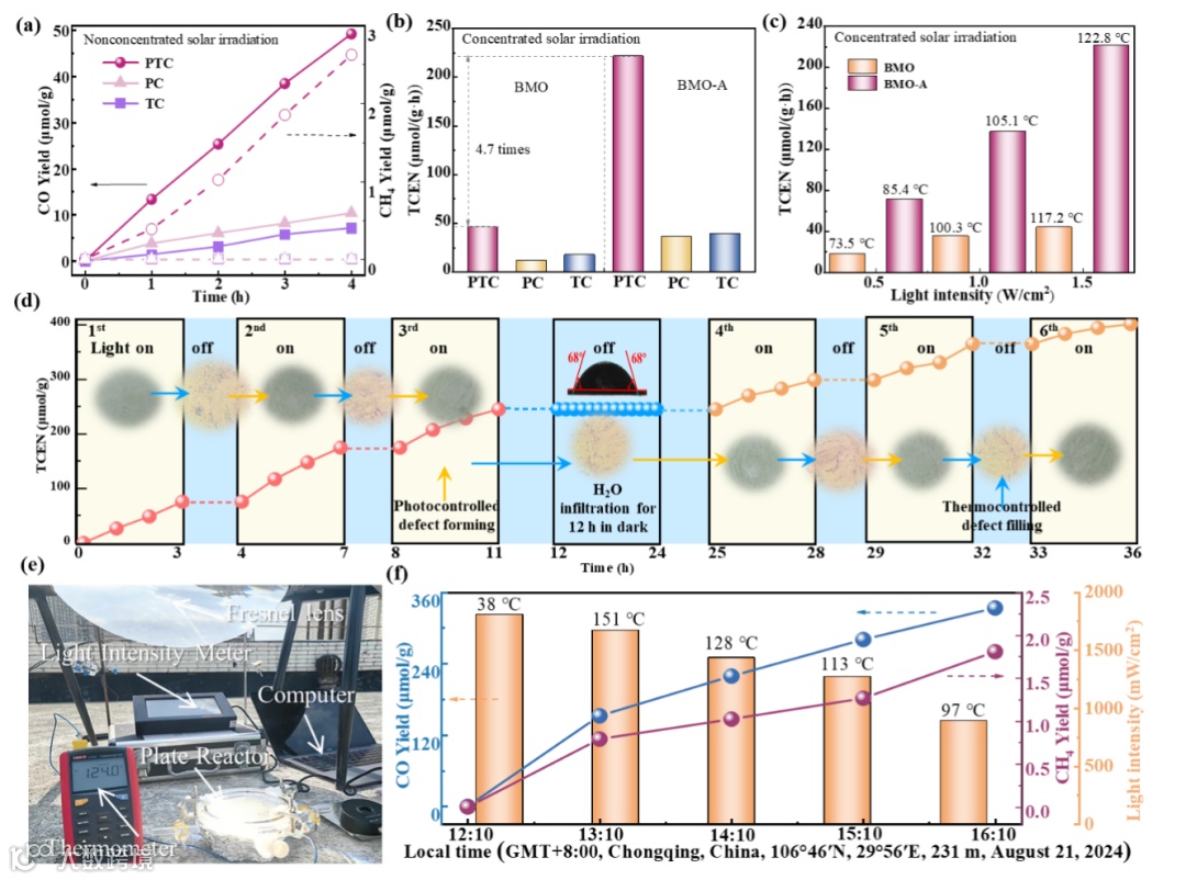 基于原子层厚度的Bi2MoO6纳米片(BMO-A)与体相Bi2MoO6(BMO)催化剂,系统开展了太阳光驱动的光热催化、光催化及热催化CO₂还原性能测试及应用潜力评估。结果表明,BMO-A展现出优异的光响应性与光热转换效率,其催化活性较体相BMO提升约5倍。在光强由0.5 W/cm2提升至1.5 W/cm2的条件下,BMO和BMO-A的催化活性分别提升2.4倍和3.1倍,催化表面温度迅速升至122.8°C。动态表面重构是该体系的重要特征之一。通过六个周期的光照与暗条件循环测试,发现BMO-A表面存在可逆的光控不饱和Bi(3-δ)+活性位点,伴随催化剂颜色在黄色与黑绿色间的周期性变化,充分证明了该动态结构重构的可控性及循环稳定性。该光控表面重构不仅显著提升了催化活性,同时通过动态自愈合机制有效维持了催化剂结构的稳定性。为验证BMO-A催化剂在实际工程条件下的应用潜力,团队开展了室外自然光聚光实验,催化剂表面温度最高达151°C,CO2还原产率达到181.3 μmol/(g·h),是体相BMO的4.1倍,彰显出其优异的光热催化性能及优良的实际适应性。