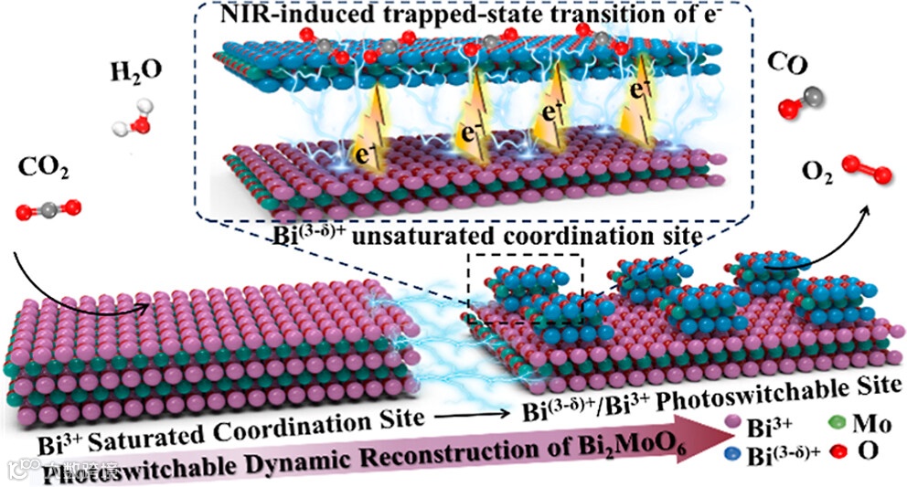 图1. 太阳光驱动CO2还原中Bi2MoO6表面Bi活性位点配位微环境处动态重构机制以及载流子迁移机理
