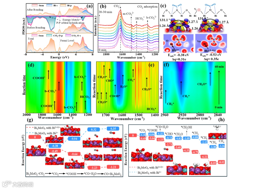 图3. 太阳驱动Bi2MoO6上CO2和H2O的催化性能以及动态重构过程研究