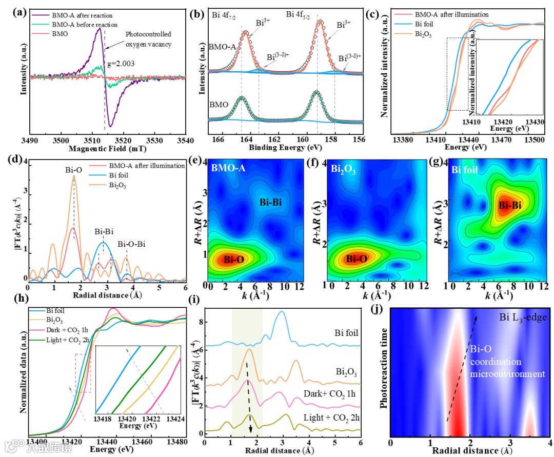 图2. 太阳光驱动CO2还原中Bi位点的配位微环境以及原位动态重构机制表征研究