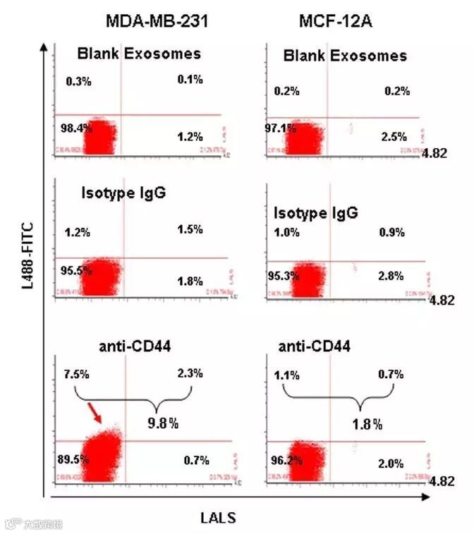 利用图1的检测参数设置,结合CD44荧光标记,分析MDA-MB-231和 MCF-12A 细胞系CD44表达阳性外泌体的丰度差异。