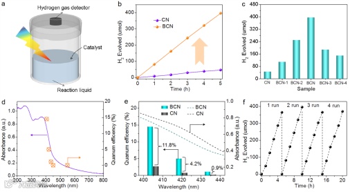 图3. (a)光催化析氢装置示意图,(b) CN和BCN的光催化析氢,(c)不同b含量的BCN样品,以10%三乙乙醇胺(V/V)为牺牲剂,3wt % Pt为助催化剂,(d) BCN表观量子产率的波长依赖性,(e)不同单波长下CN和BCN的外量子效率比较,(f)光催化析氢稳定性测试。