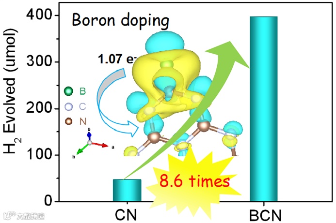 图1. 在CN π共轭体系中引入B掺杂,不仅能诱导电子离域,而且能增强光致电子-空穴对的分离和转移,这使得光催化产H2的效率提高了8.6倍
