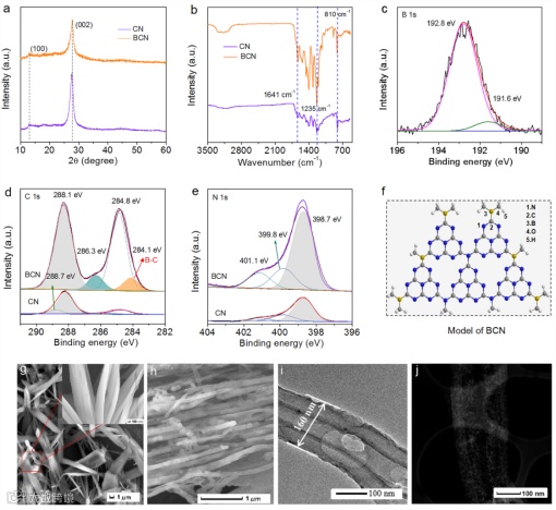 图2. 催化剂形貌与结构分析。(a) CN和BCN的XRD谱图,(b) FT-IR光谱和XPS光谱的比较:(c) B1s, (d) C1s, (e) N1s;(f) BCN分子结构示意图; (g) BCN前体的SEM图像;(h) BCN的SEM,(i) TEM和(j) HAADF-TEM图像。
