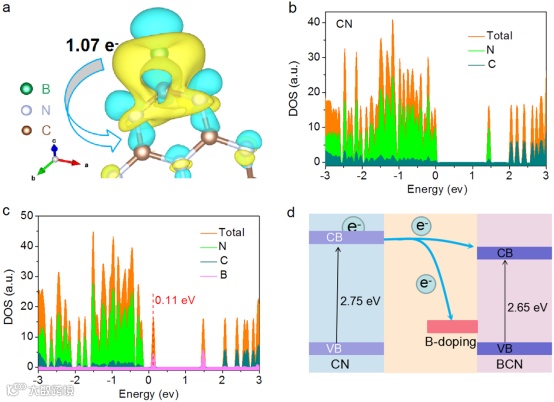 图5. (a) BCN的电荷密度不同,黄色和浅蓝色的电荷密度分别代表浓缩和稀缺的静电势尺度,(b)和(c)计算的DOSs,其中B的引入可以改变π共轭CN体系的电子结构。(d)原始CN和BCN催化剂的能带结构演化示意图。