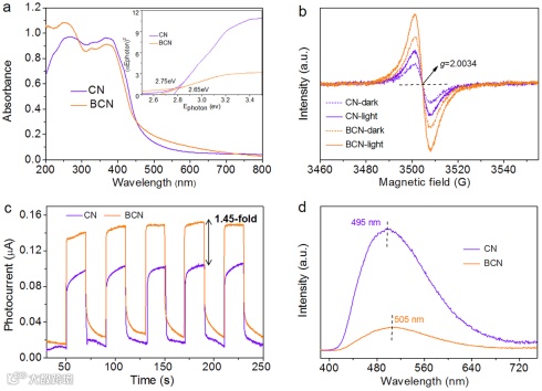 图4. (a)紫外可见光谱(插入图是用于估计带隙能量的Tauc/Davis-Mott图)。(b)室温下暗处和可见光下的EPR光谱,(c)光电流响应,(d) CN和BCN催化剂的光致发光(PL)光谱(光致发光由375 nm入射光激发)。