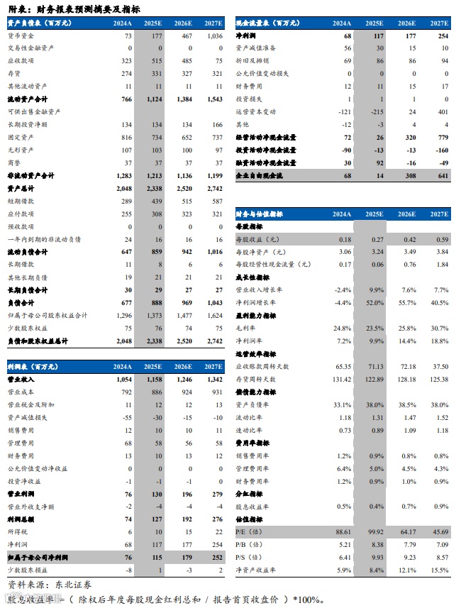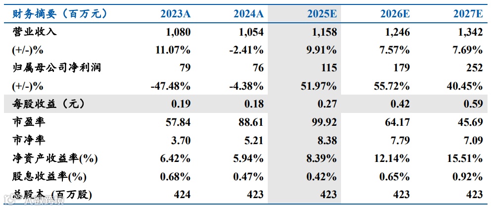 我们预计2025-2027年公司实现归母净利润1.15/1.79/2.52亿元,对应PE为99.92X/64.17X/45.69X,维持“增持”评级。
