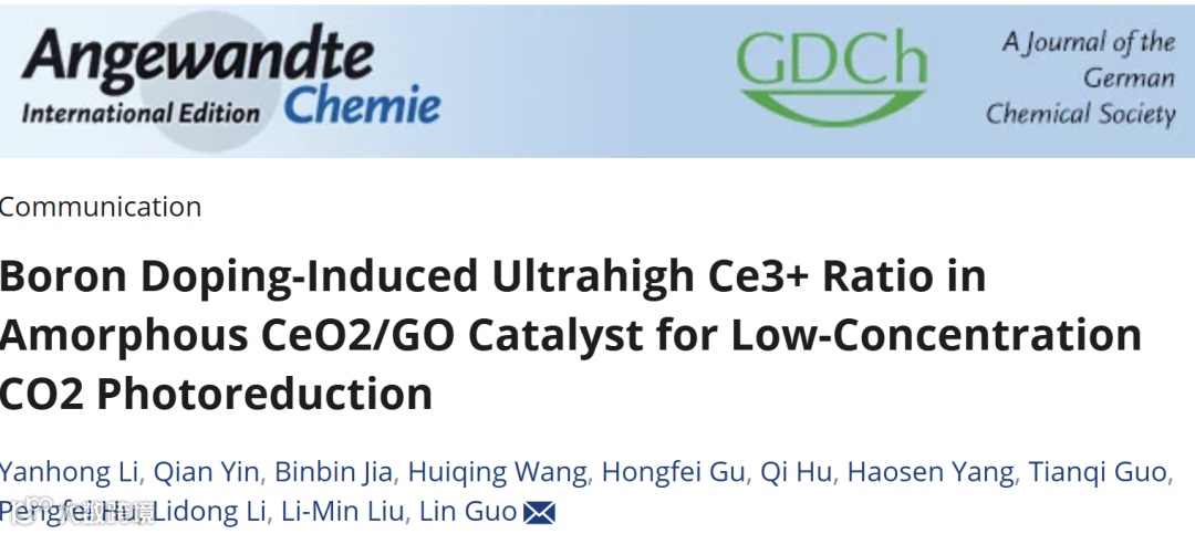 基于此,来自北京航空航天大学的郭林教授与刘利民教授合作,在国际知名期刊Angewandte Chemie International Edition上发表题为“Boron Doping-Induced Ultrahigh Ce3+ Ratio in Amorphous CeO2/GO Catalyst for Low-Concentration CO2 Photoreduction”的文章。该文章针对4f电子调控这一难题,提出了一种创新策略:通过异质离子掺杂诱导CeO2非晶化,打破晶体对称性对4f电子的束缚,实现4f电子态的有效调控和Ce3+含量的显著提升。