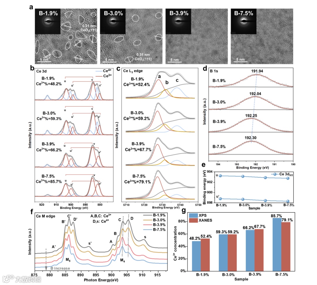 该非晶化策略的关键在于破坏传统CeO2晶体中对称性的有序结构。在该晶体中,每个氧原子通常与四个铈原子配位(OⅣ),形成高度稳定的结构。研究团队通过引入B掺杂,使每个B原子与三个O原子结合,形成平面结构的BO33-基团。这种结构单元不仅削弱了原有的Ce–O键,诱导形成大量三配位氧(OⅢ),同时也破坏了晶体对称性,成功促使CeO2发生非晶转变。第一性原理计算表明,B掺杂引起的结构畸变在CeO2带隙中引入了f轨道中间态,增强了Ce4+向Ce3+的还原趋势,且Ce3+比例随B含量增加而升高。当B掺杂量达到7.69%时,Ce3+含量可高达75%。