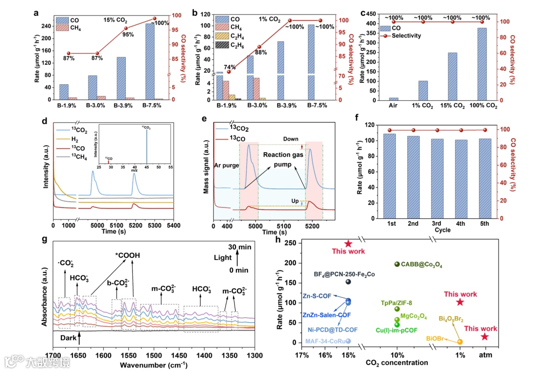 在低浓度CO₂光催化还原测试中,B-7.5%催化剂展现出卓越性能:15% CO₂浓度下,CO生成速率达249.33 μmol·g-1·h-1,选择性100%;即使CO₂浓度降至1%,速率仍可保持103.4 μmol·g-1·h-1, 远超同类催化剂。