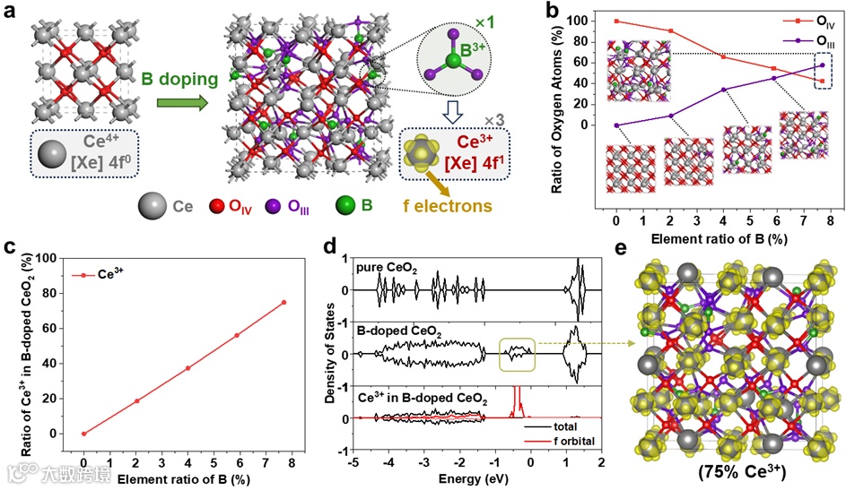 图1.基于第一性原理计算掺B对CeO2原子和电子结构的影响。
