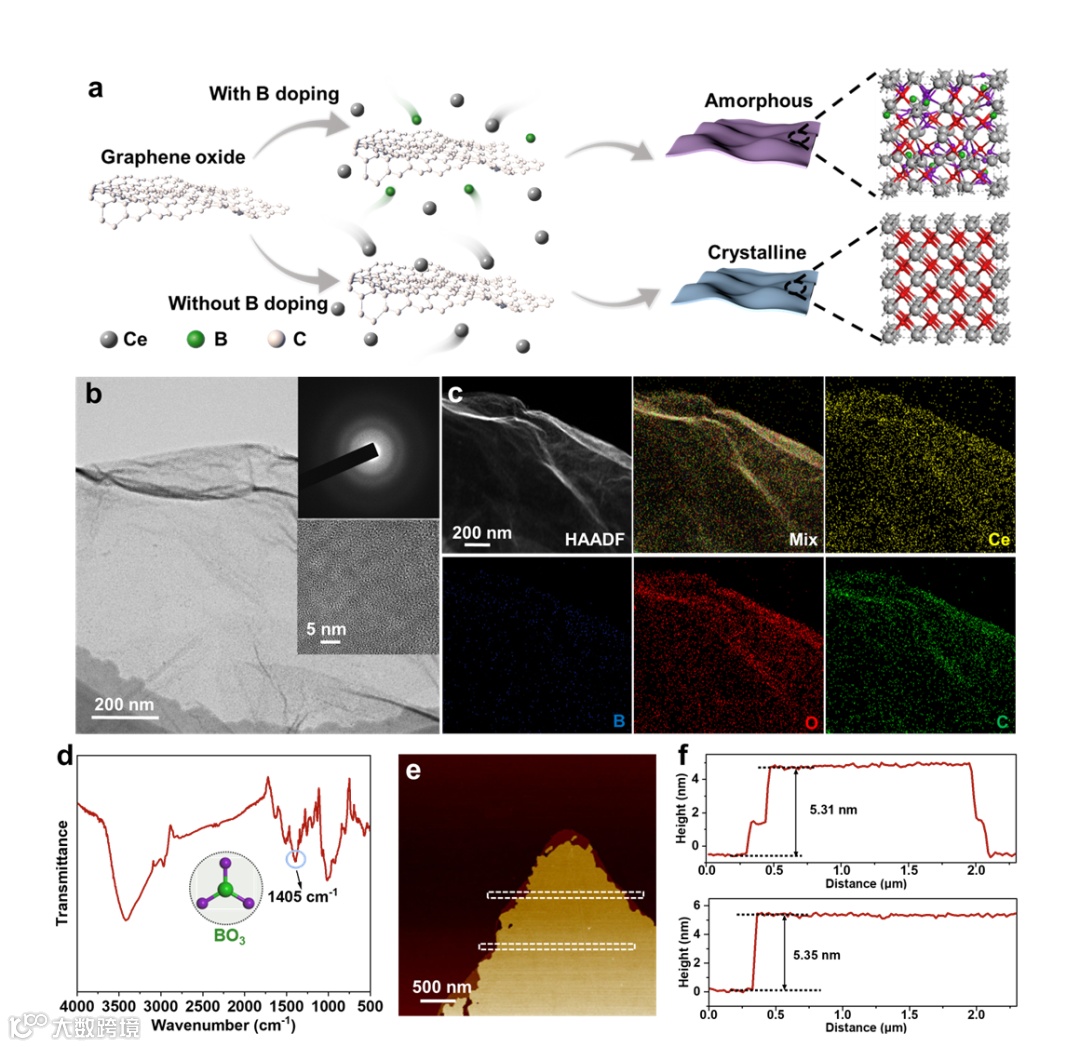 为实现这一目标,研究团队采用湿化学法,以氧化石墨烯作为基底制备了B掺杂、表面平整厚度约5.3 nm的非晶CeO2纳米片。EDS结果确认Ce、B、C和O元素分布均匀,FTIR光谱进一步证实B以BO3基团形式存在于材料中。