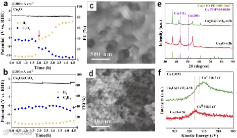 CeOX壳层通过双重机制抑制结构失稳:物理屏障作用:致密壳层有效阻挡Cu2+浸出(ICP 检测显示浸出量减少80%),避免纳米颗粒因离子流失而团聚。反应4.5小时后,Cu2O聚集成多孔蜂窝状结构,而Cu2O@CeOX仍保持分散均匀的纳米立方体形态。化学保护作用:Ce3+/Ce4+ 氧化还原对通过电子调控抑制Cu+还原,XRD显示反应后Cu2O@CeOX的Cu0特征峰强度极弱,而Cu2O中Cu0峰强度与Cu2OC峰接近;Cu LMM俄歇光谱显示,前者维持 Cu⁺态(916.7 eV),后者显著向Cu0态(918.6 eV)偏移。循环伏安法(CV)进一步证实,CeOX壳层抑制了Cu的氧化还原活性,从而稳定催化位点。