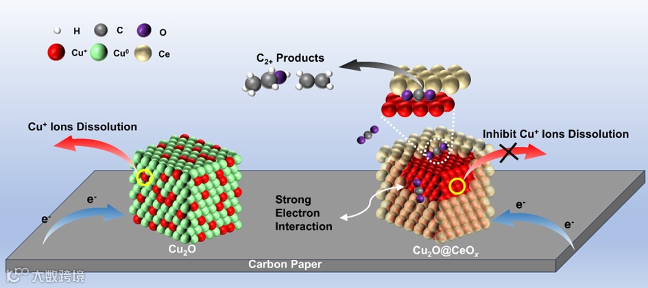 图1 碳纸负载的Cu2O@CeOX核壳纳米催化剂用于CO2电还原反应的设计及优势。