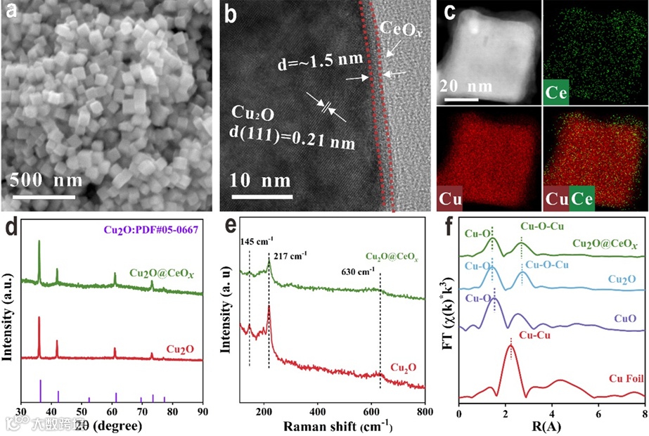 通过一步水热法精确调控铈盐比例(3% Ce 含量最优),成功制备出“结晶态Cu2O核-无定形CeOX壳”结构:内核为约50 nm的Cu2O纳米立方体,(111)晶面晶格条纹清晰(d=0.21 nm);外壳为均匀包覆的约1.5 nm无定形CeOX层,EDS-Mapping显示Ce/O信号仅存在于表面,Cu均匀分布于内核。高分辨透射电镜(HR-TEM)与选区电子衍射(SAED)证实外壳无结晶衍射斑点,XRD 图谱仅出现Cu2O特征峰,进一步确认CeOX的无定形属性。当Ce含量提升至5%以及8%时,CeOX颗粒显著团聚,导致核壳结构破坏,表明精准控制Ce盐比例是合成关键。