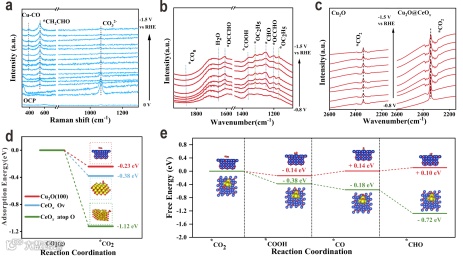 密度泛函理论(DFT)计算表明,CeOX壳层使CO2吸附能从-0.72 eV(Cu2O)降至-1.12 eV,并将*OCCHO生成能降低0.38 eV,显著提升反应动力学。
