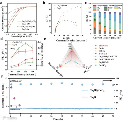 Cu2O@CeOX在300 mA cm-2大电流密度下实现81.8%的C2+法拉第效率,较纯Cu2O(72%)显著提升,且所需电位-1.2 V降至- 0.98 V,体现更低能耗优势。其稳定性实现质的飞跃:持续反应50小时后,C2+法拉第效率仍稳定维持在80%以上,而Cu2O仅2小时即因结构崩溃导致效率降至10%以下。与文献中 Cu-PTFE-99 NN(65% FE, 25 h)、Cu/SiO₂(55% FE, 15 h)等催化剂相比,该体系在电流密度、选择性与耐久性的综合表现均达先进水平。
