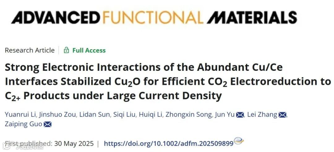 近日,深圳大学张雷教授与於俊教授团队联合阿德莱德大学郭再萍教授,在国际知名期刊《Advanced Functional Materials》上发表题为 “Strong Electronic Interactions of the Abundant Cu/Ce Interfaces Stabilized Cu2O for Efficient CO2 Electroreduction to C2+ Products under Large Current Density” 的研究论文。