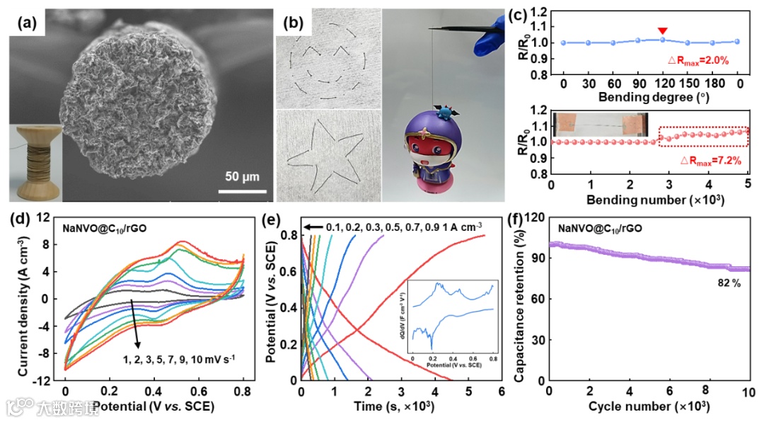 图2 NaNVO@C10/rGO纤维电极机械柔性和电化学性质:FE-SEM横截面图像和柔韧性(插图)(a),可编织性和拉起55 g卡通玩具光学照片(b),不同弯曲角度和弯曲5000次循环后相对电阻变化(c),不同扫描速率下CV曲线(d),不同电流密度下GCD曲线(e)和长循环稳定性(f)