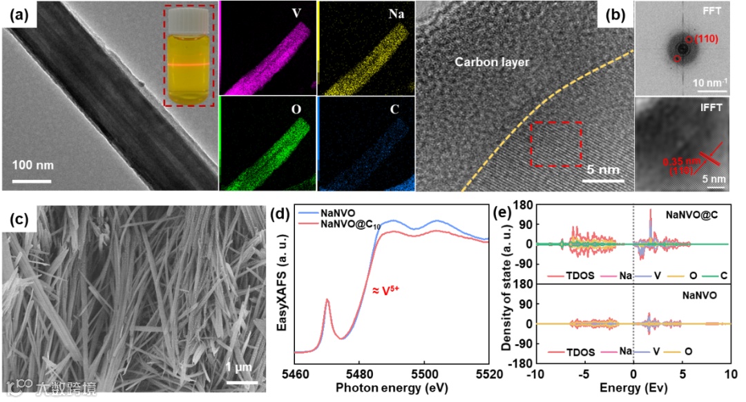 图1 NaNVO@C10纳米线形貌和结构表征:TEM图像(a),高分辨率TEM图像(b),FE-SEM图像(c),NaNVO和NaNVO@C10 的V K边X射线吸收精细结构(EasyXAFS)光谱(d),NaNVO和NaNVO@C的态密度(DOS)(e)