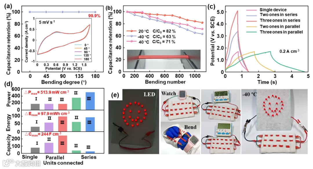 图6 NaNVO@C10/rGO//MXene AFSIC的柔韧性及应用演示:弯曲角度从 0° 到 180° 时的电容保持率曲线(插图为5 mV s-1下循环伏安曲线)(a),不同温度下以0 ~ 180° 弯曲 1000 次后的电容保持率曲线(插图为AFSIC光学照片)(b),0.2 A cm-3下1-3个组装单元串联或并联集成器件GCD曲线(c),0.2 A cm-3下1-3个组装单元串联或并联集成器件的比容量、能量密度和功率密度(d),组装器件串联和并联集成在手套或作为LED和电子表电源应用实例(e)