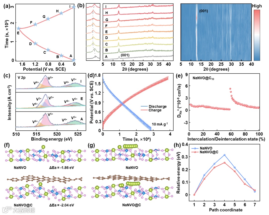 图5 NaNVO@C10正极Na+储存机理:50 mA g-1时NaNVO@C10//Ti3C2Tx扣式电池GCD曲线(a),室温下GCD曲线点对应的非原位XRD图(b),不同充放电状态下的V 2p XPS谱(c),10 mA g-1时GITT曲线(d)和充放电过程中钠离子扩散系数(e),NaNVO和NaNVO@C正极钠离子吸附位点和吸附位点的吸附能(f),钠离子扩散路径模型(g),DFT模拟计算NaNVO和NaNVO@C正极钠离子迁移路径的能量分布图(h)