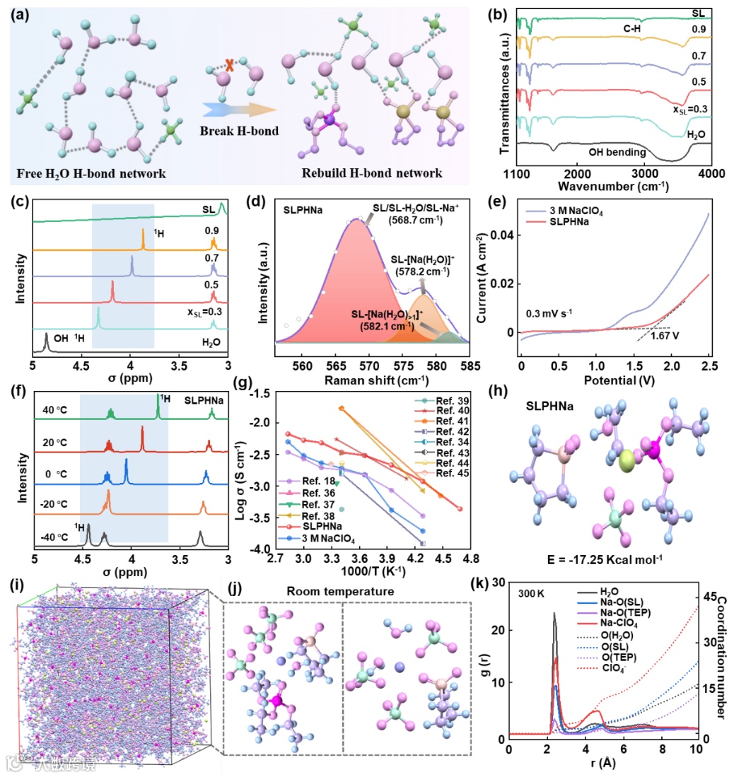 图3 SL/H2O溶剂、SLPH溶剂和SLPHNa电解质表征:SLPHNa电解质设计原理图(a),FT-IR光谱图(b),20 °C 1H NMR谱图(c),-SO2基团区域Raman光谱图(d),0.3 mV s-1下SLPHNa和3 M NaClO4电解质LSV曲线(e),-40 ~ 40 °C不同温度下1H NMR谱图(f),与其他低温电解质的离子电导率比较(g),DFT计算得到的结合能(h),通过DFT计算和MD模拟得到的结构优化(i),钠离子配位情况示意图(j),300 K时径向分布函数(RDF)(k)