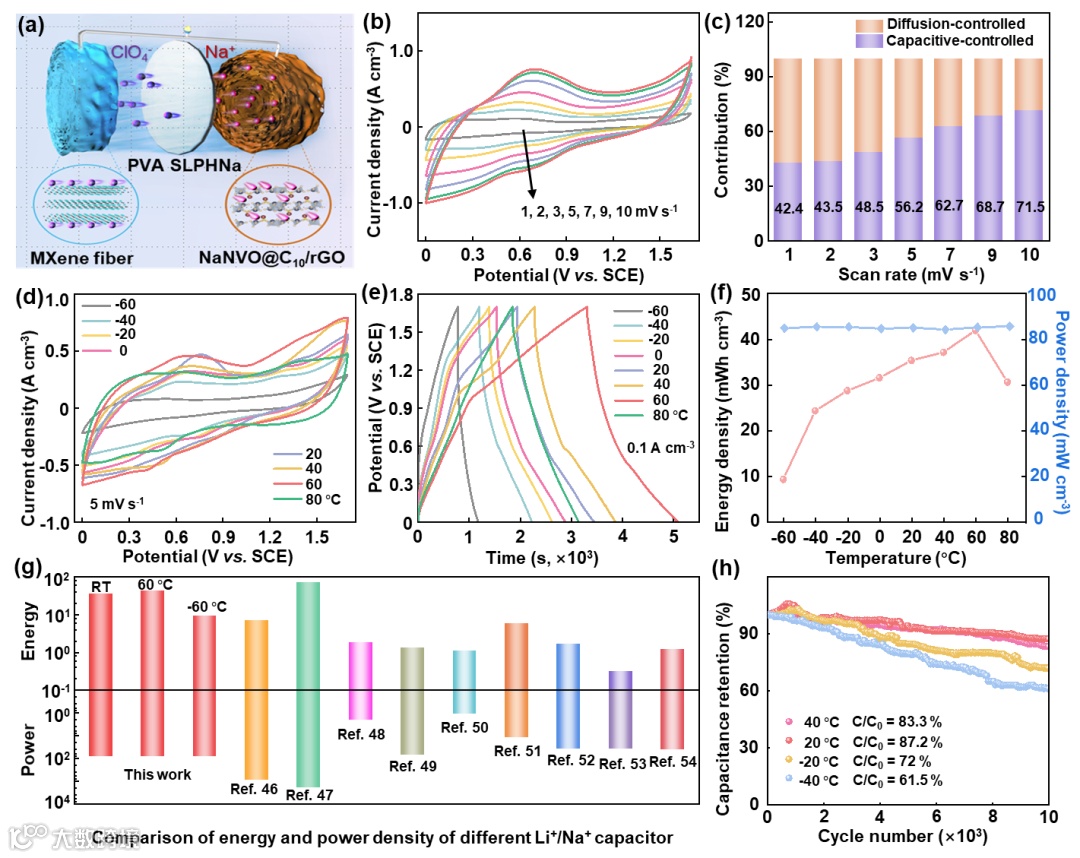 图4 NaNVO@C10/rGO//MXene AFSIC电化学性能表征:钠离子纤维混合电容器组装示意图(a),不同扫速下CV曲线(mV s-1)(b),电容性贡献(紫色)和扩散限制贡献(黄色)的占比(c),-60 ~ 80 °C范围内CV曲线(d)和GCD曲线(e),体积能量密度(EV)和体积功率密度(PV)随温度变化曲线(f),不同Li+/Na+电容器能量密度和功率密度的比较(g),-40 ~ 40 °C温度范围内循环10000次后的循环稳定性(h)