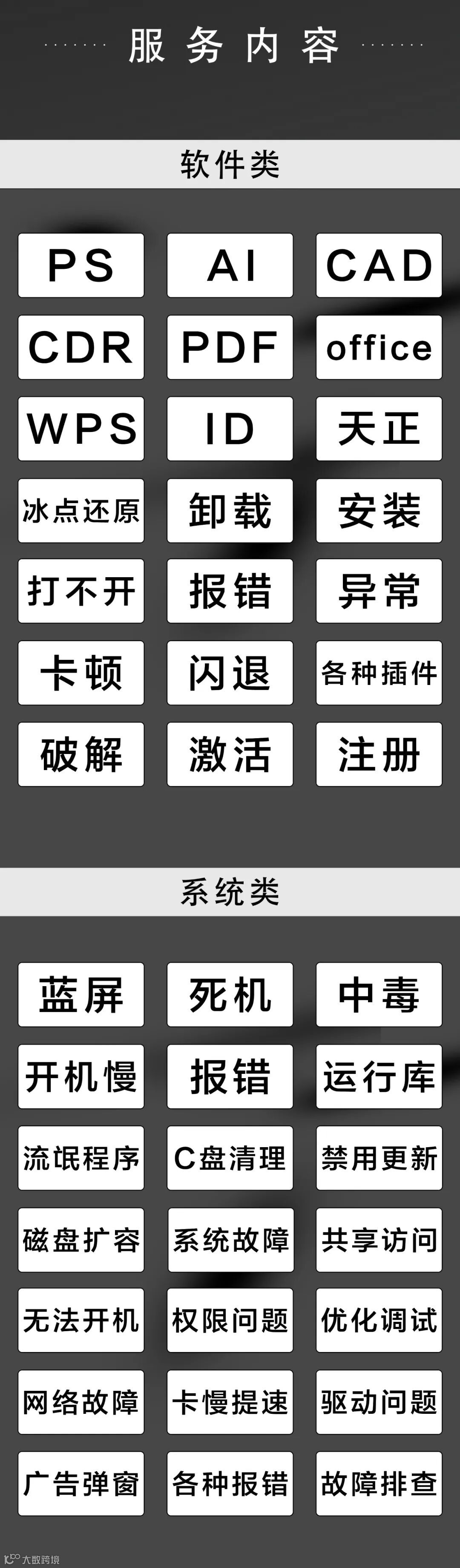 4、系统故障:处理各类电脑系统问题,如蓝屏、中毒、死机、卡顿,网络出错,焕然一新。 |