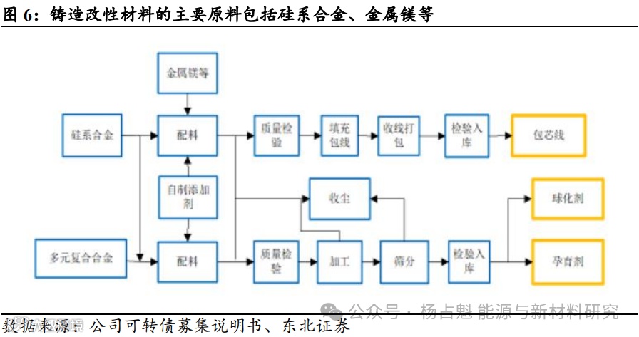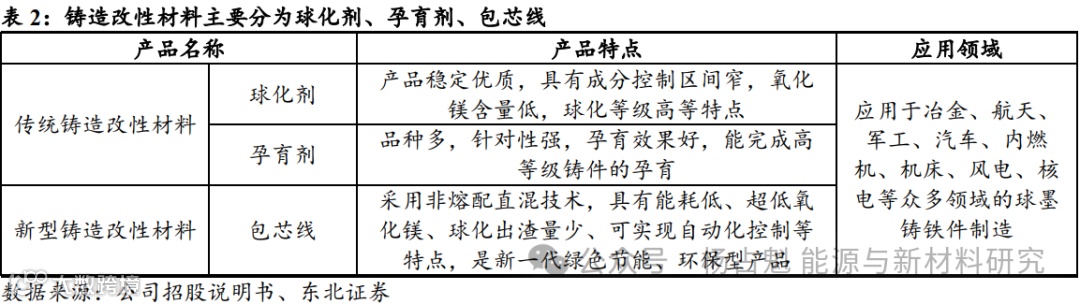 铸造改性材料:主要分为球化剂、孕育剂、包芯线,广泛应用于球墨铸铁领域。在球墨铸铁铸造过程中,添加铸造改性材料后,能够实现铁水脱氧脱硫、净化铁水夹杂物、球化片状石墨等目标,从而改善铸铁性能、提高铸铁品质,特别是增强铸铁的塑性、韧性等性能。公司经过多年技术创新,成功研发了非熔配直混法包芯线生产技术,与传统生产工艺相比,非熔配直混法工艺减少了硅铁、硅钡等合金熔配环节,节能减耗成效显著,在国内部分球墨铸造领先企业成功运用。