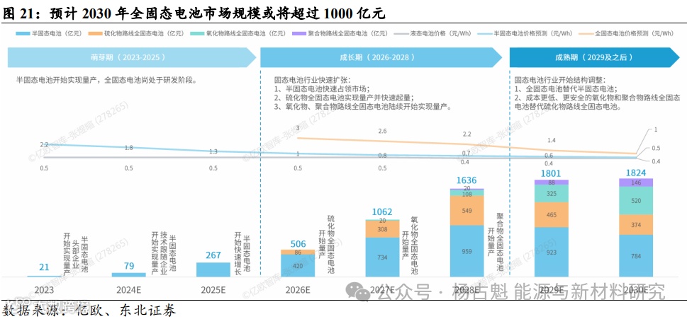 总结:从产业化进度来看,国内主流企业披露的全固态电池产品量产时间,基本在2026-2030年范围。在2024年9月举行的宜宾市固态电池创新产业园启动仪式暨欧阳明高院士工作站成果发布会上,四川新能源汽车创新中心有限公司总经理助理、固态电池与新材料中心主任朱高龙表示,欧阳明高院士工作站预计2027年全固态电池产品下线,2030年固态电池全面放量投产,产值将超1000亿元。