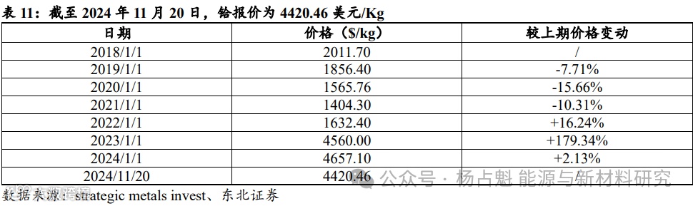 2021年之后,铪价格迅速提升。铪广泛应用于航空航天、半导体、原子能等领域。2020年之前占铪消费量约一半的航空航天行业需求低迷,现货供应活动放缓,铪价格企稳且无大幅波动。2021年开始,人工智能浪潮后航空航天及电子工业需求强劲增长导致铪供需失衡,全球铪价一路从1000美元/千克左右飙升至接近5000美元/千克,创下历史新高。截至2023年6月底,铪价格已达到4933.7美元/千克,较2023年初上涨8.2%,较2022年初上涨202.2%。据strategic metals invest,截至2024年11月20日,铪报价为4420.46美元/Kg。
