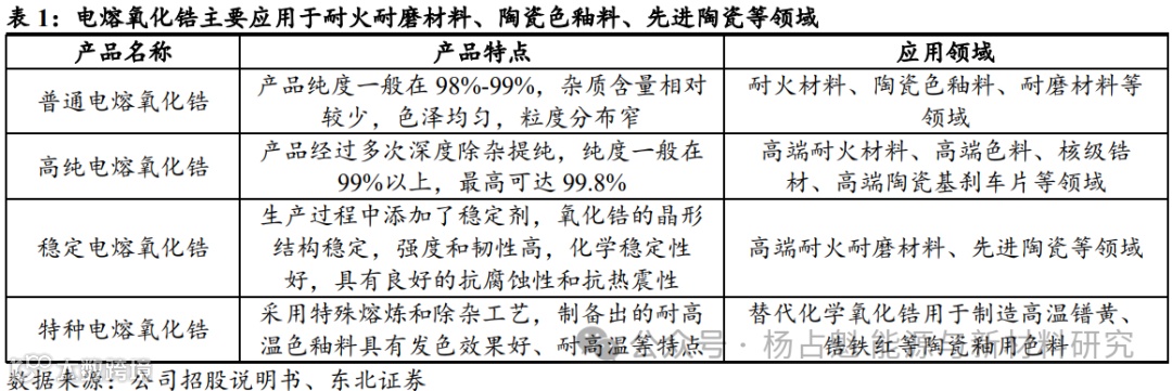 电熔级氧化锆:公司实际产能可达2.6万吨,是国内最大供应商之一。电熔氧化锆属于无机非金属材料,具有高熔点、高硬度、高强度、高韧性、高耐磨性及耐腐蚀性等特点,主要应用于耐火耐磨材料、陶瓷色釉料、先进陶瓷等领域;近年来,电熔氧化锆在核级锆材、高级色釉料与先进陶瓷等诸多新兴领域的应用也快速发展。