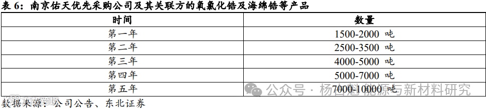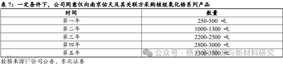 (2)协议有效期内,在南京佑天及其关联方核级氧化锆产品质量 、交付及服务等能够满足公司使用标准且有竞争优势的前提下,公司同意仅向南京佑天及其关联方采购核级氧化锆系列产品,并且南京佑天及其关联方生产的核级氧化锆产品除供给公司及关联方用于生产核级海绵锆外,供应给其他直接或间接用于生产核级海绵锆的国内其它企业不超过 2 家,公司每年预计采购计划如下(实际以双方签订的采购合同为准):
