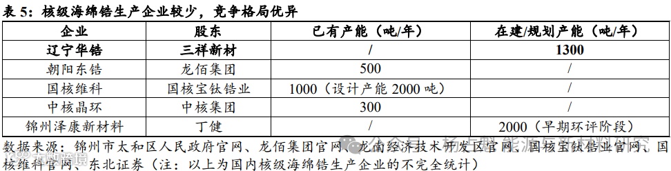 (3)朝阳东锆:龙佰集团控股朝阳东锆新材料有限公司,目前拥有年产1000吨工业级海绵锆和500吨核级海绵锆2条生产线,产品核级海绵锆、核级四氯化锆、核级二氧化锆、工业级海绵锆、工业级四氯化锆、二氧化铪等主要应用于核工业领域。