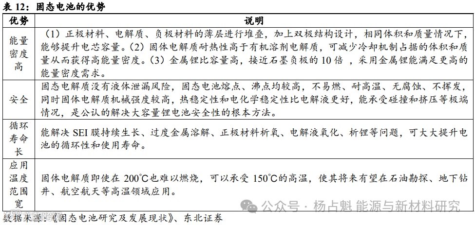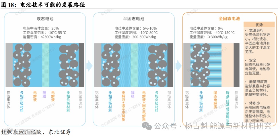 全固态电池采用固态电解质替代电解液后,电芯不再需要隔膜,电池结构趋于简洁。与液态及半固态电池相比,全固态电池能够在更宽广的温度范围内稳定运行,展现出更高的热稳定性和化学安全性。此外,全固态电池支持更高的能量密度,这意味着在相同电能输出下,电池体积更为紧凑,有助于节省空间并提高设备的能效比。