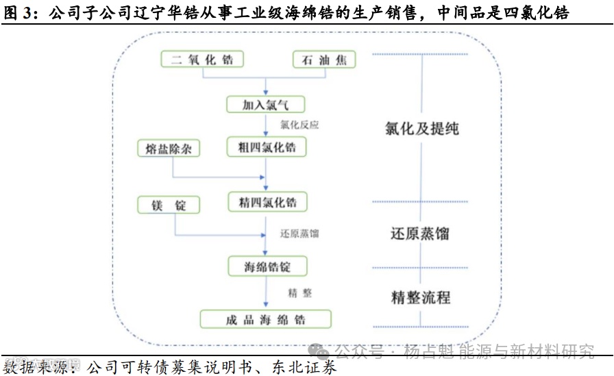 (1)工业级海绵锆:公司工业级海绵锆产能已达5000吨/年,公司子公司辽宁华锆主要从事工业级海绵锆的研发、生产及销售,其主要生产工艺流程包括氯化提纯、还原蒸馏和精整3个环节。由工业级海绵锆加工而成的锆金属制品具有耐酸、耐碱、耐温以及导热性能良好等特点,其环保、安全、耐用属性突出,制成的管道和设备不易腐蚀、泄露和损坏。近年来,在环保要求日益提升的情况下,海绵锆用于制作化工耐腐蚀设备,尤其是在磷酸及醋酸行业化工设备方面得到较大规模的应用。在合金行业,尤其在永磁行业、锆铬铜合金、锆镁合金、锆铝合金、锆钒铁吸气剂等行业对海绵锆需求也有所增加。海绵锆在液态金属(非晶合金)、溅射靶材、钢铁等行业的相关应用也属于上升期,预计未来市场需求空间将越来越广阔。此外,海绵锆因具有良好的吸氢材料特性,在氢储能领域也得到很好的开发应用,公司海绵锆已开始小批量获得国内氢储能企业的商业化应用。公司作为国内工业级海绵锆龙头生产企业,与国内几家大型国企始终保持着强强联合的战略合作伙伴关系。