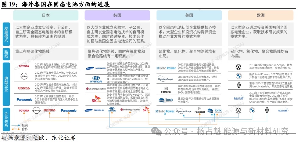 现阶段,国内头部整车与动力电池企业,如比亚迪、上汽、蔚来、广汽、赛力斯、长安、东风、江淮、奇瑞、宁德时代、孚能科技、国轩高科、欣旺达等均在固态电池领域有所布局,进展不一。外资企业,如丰田、日产、三星SDI等全球领先制造商的全固态电池已进入试制阶段,奔驰、大众和通用汽车等也在积极布局这一领域。此外,还有不少创业公司凭借技术创新和积累,闯入这一赛道。