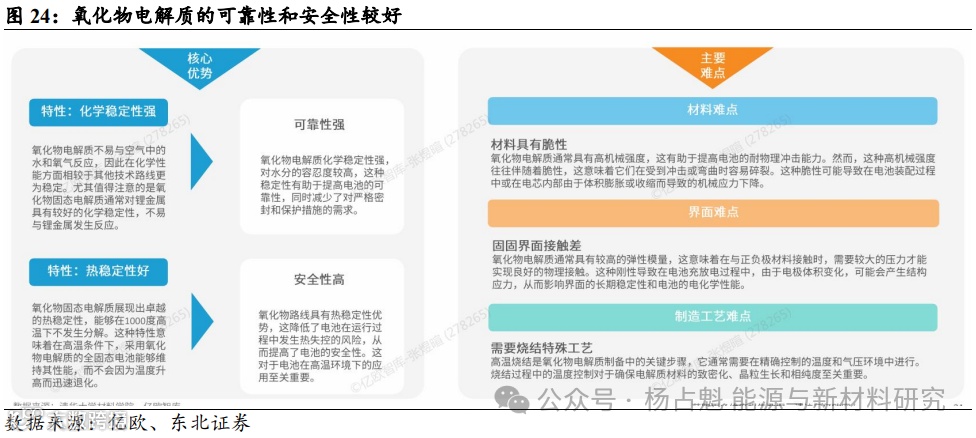 (2)氧化物电解质:具有较好的稳定性。氧化物电解质的离子电导率比聚合物更高,热稳定性高达1000℃,机械稳定性和电化学稳定性都较好,但存在脆性较大、加工性能差、界面接触差等问题。氧化物电解质路线是国内企业的重要关注方向,如卫蓝新能源、辉能科技、清陶能源、赣锋锂业等,日本SONY和美国QuantumScape也在氧化物电解质方面有所布局。