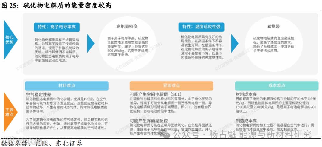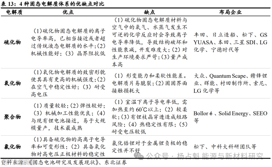 (3)硫化物电解质:离子电导率高,能量密度高。硫化物电解质机械性能好,在全固态电池中发展潜力大。但是硫化物电解质也存在容易氧化、化学稳定性差、制备难度较高、和Li金属负极相容性差等问题。硫化物电解质主要受到日韩企业的关注,如丰田、松下、LG化学、出光兴产等,国内宁德时代也通过专利布局了硫化物电解质技术路线。